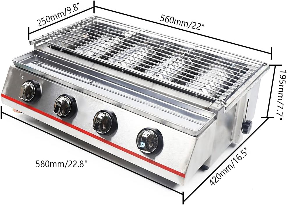 Note: Gas hose not included!DetailsHeight Adjustable: The height of the baking tray can be adjusted according to needs.Food Tray: The grill is in front of the food tray, you can put the grilled food on the tray so that the food won't get dirty.Oil Tray: There is a nonstick oil tray at the bottom of this item. Before each grilling, just brush the tray with a small amount of oil to reduce smoke and ease cleaning.SpecificationsDimension: 58*42*19.5cm / 22.8*16.5*7.7 inchesGrill Size: 56*25cm / 22*9.8 inchesGross Weight: 8.5kg/18.7 lbsNet Weight: 8kg /17.6 lbsIntensity of Pressure: 2800PaShield Material: Steel ShieldMaterial: Stainless SteelColor: SilverPackage List:1*4 Burners Gas BBQ GrillNotes1.Please note that there is only 4 burners grill in the package, the low-pressure valve and hose are not included.2.Please Use LPG Gas (Liquefied Petroleum Gas), please find a professional hardware store to replace the nozzle.3.This machine is forbidden to use medium and high pressure, only a low-pressure valve can be used.4.Please Use LPG Gas (Liquefied Petroleum Gas).5.This Machine Is Prohibited To Use Medium And High Pressure, Only Low Pressure Valve Can Be Used.6.Please Prepare 2800Pa Low Pressure Valve And Gas Hose(Not Included). Because The Requirements And Standards Of Each Country Are Different, Customers Need To Purchase Them Locally. (Gas Hose Diameter: About 1cm/0.39in).