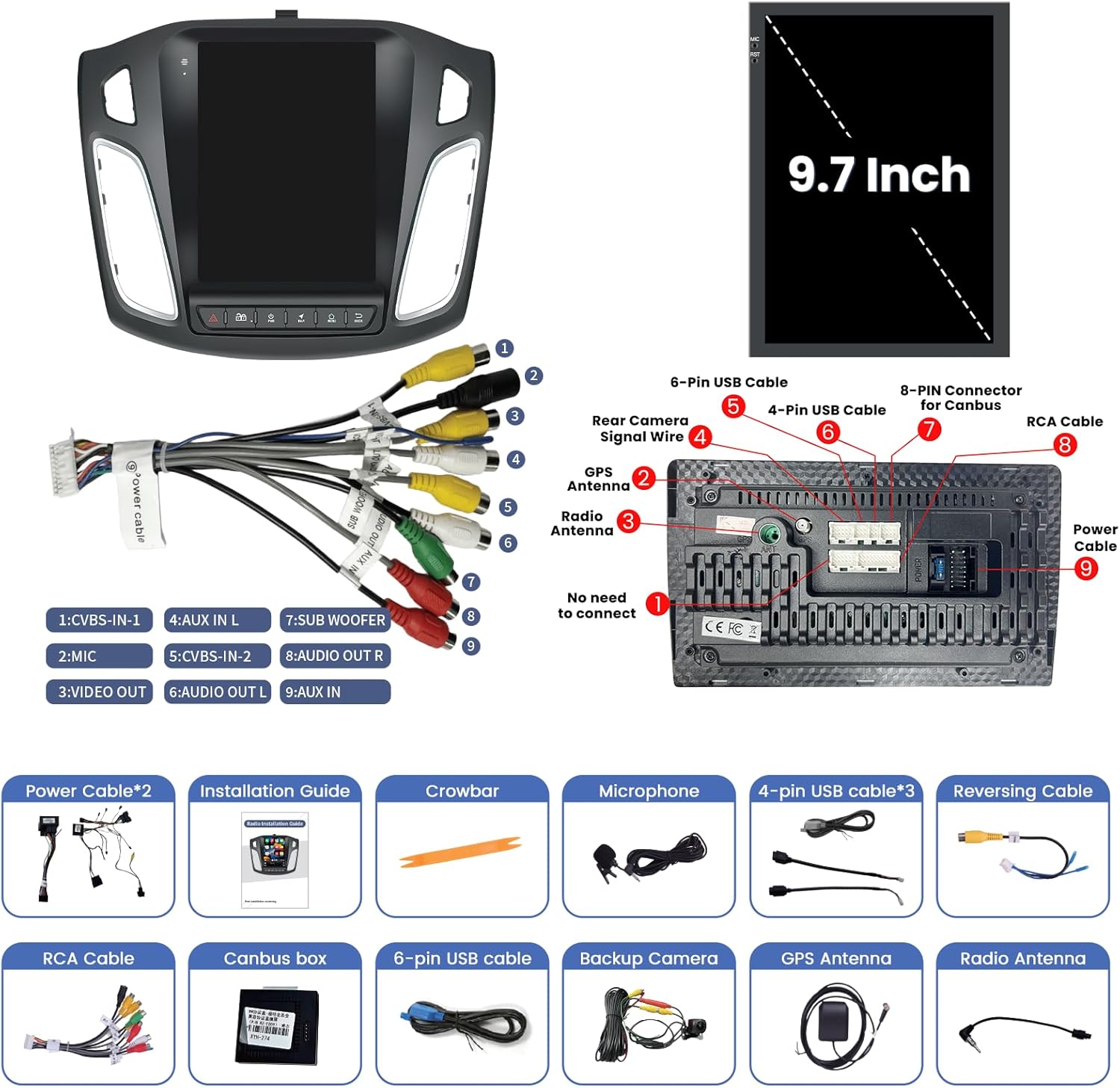 | BuiltIn Media | Power Cable*1, Can Bus*1, GPS Antenna*1, RCA Cable*1, Reversing Cable*1, Radio Extension Cable*1, USB Cable*2, Crowbar*1 |