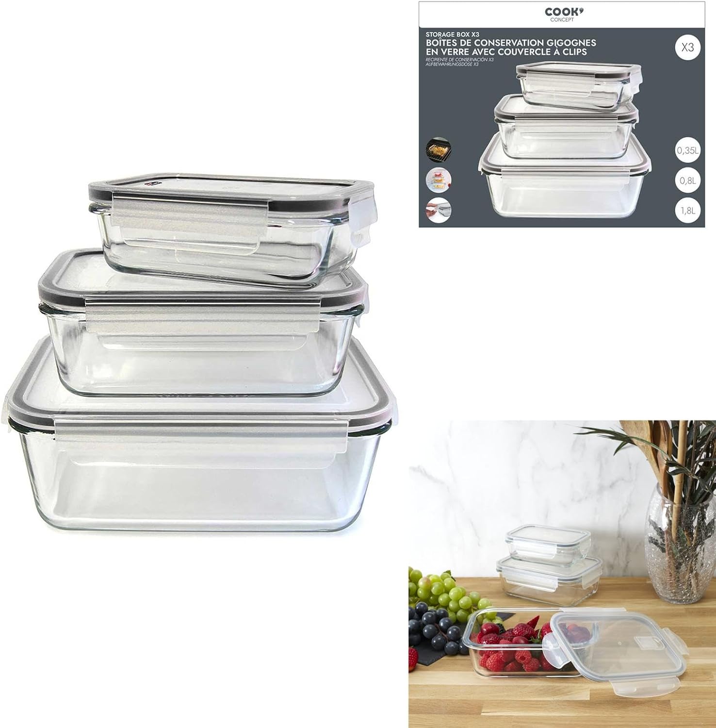 This set of 3 rectangular glass dishes with plastic lids has a dual purpose. It is suitable for oven and microwave cooking and can also be used as an airtight container for storing food. The model tolerates machine washing and storage in the freezer.