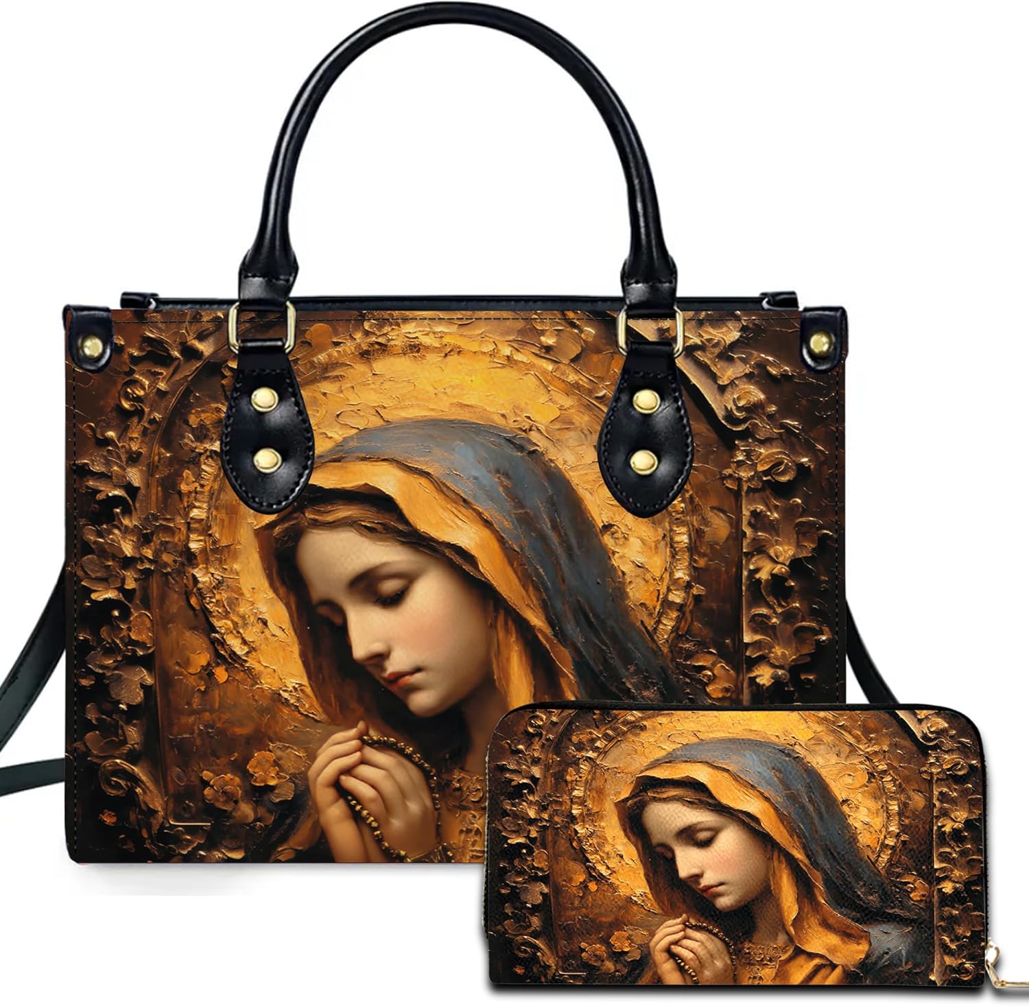 Carry your faith with elegance. This Virgin Mary Leather Handbag is a beautiful blend of devotion, art, and everyday practicality. Featuring a detailed depiction of the Virgin Mary surrounded by soft florals, itโs a handbag that inspires peace and comfort every time you carry it. Crafted from premium vegan leather, the bag is smooth, durable, and printed in vibrant high-definition on both sides. The spacious interior holds your daily essentials โ from your phone and wallet to notebooks, makeup, or prayer items โ while the secure zipper keeps everything protected. Choose to include the matching purse for an elegant, faith-inspired set. Whether used for church, Bible study, work, or everyday errands, this handbag offers both spiritual meaning and modern convenience. A heartfelt gift for any Christian woman who loves the Virgin Mary and appreciates items that reflect her faith. ๐ PRODUCT DETAILS Material: Premium PU vegan leather Printing: Double-sided HD color print Bag Sizes: Small / Medium / Large Optional Purse Size: 7.9โ x 4.3โ x 1โ Straps: Hand straps + removable adjustable shoulder strap Closure: Secure zipper Care: Wipe clean with damp cloth Style: Christian / Catholic / Virgin Mary floral design