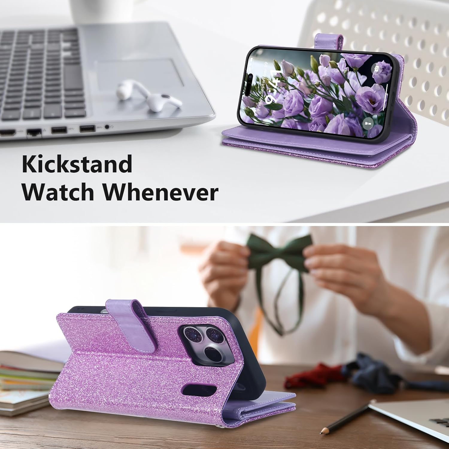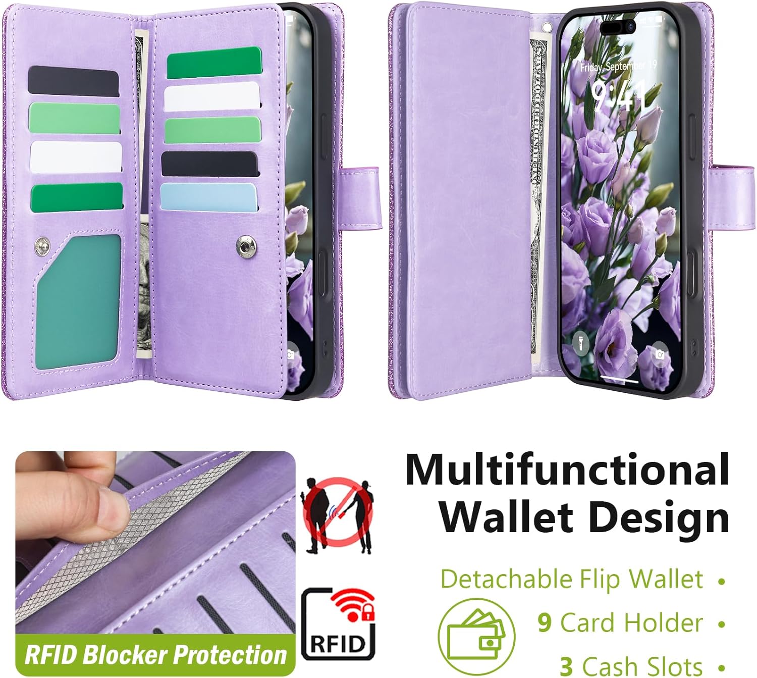 | Additional Features | 2-in-1 RFID Blocking Wallet Phone Case, Card Slot, Detachable Magnetic Phone Cover, Premium Fashion Glitter for Women, With Removable Wristlet Strap |
