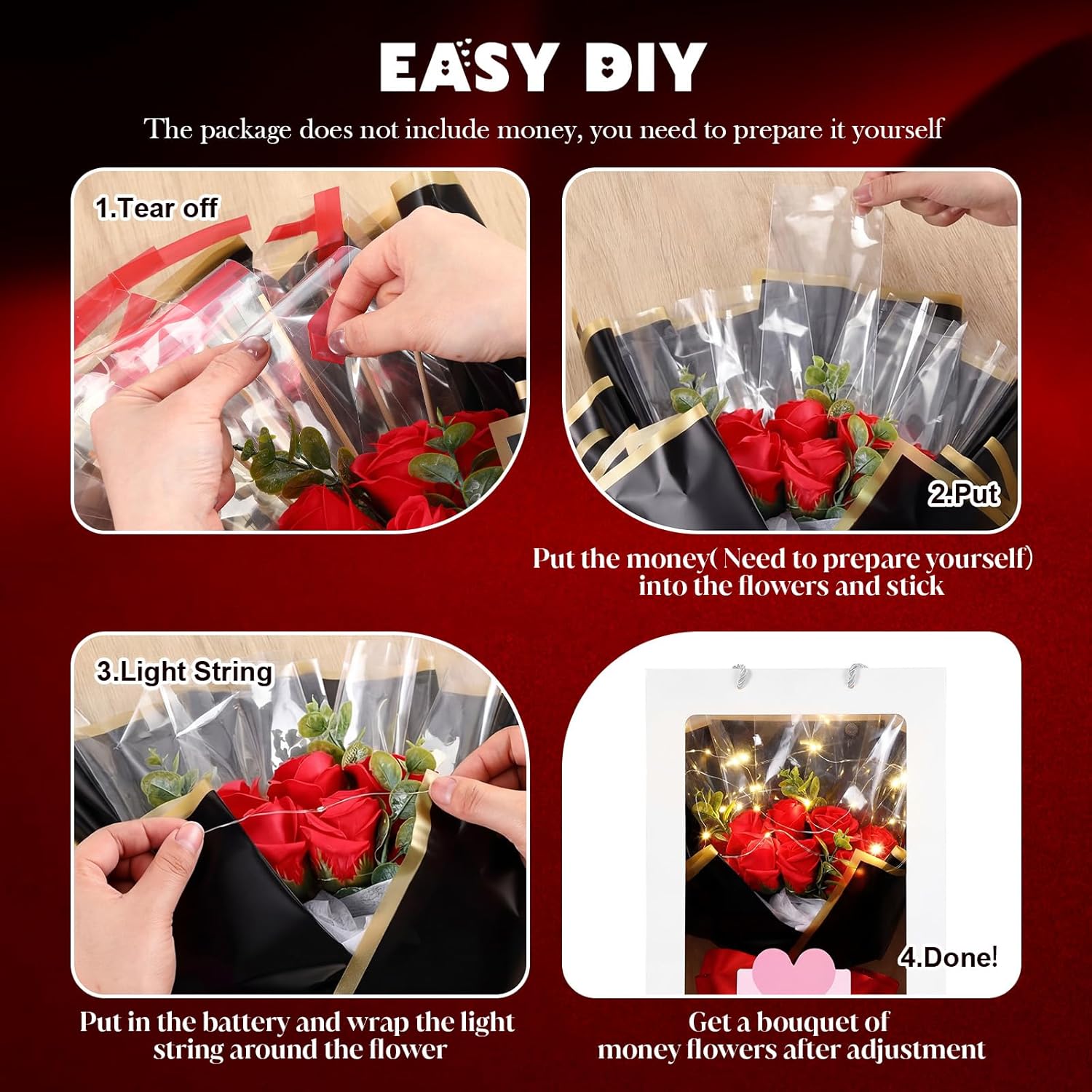 | Included Components | 1 x Gift box, 1 x Light String, 1 x Money flower bouquet |