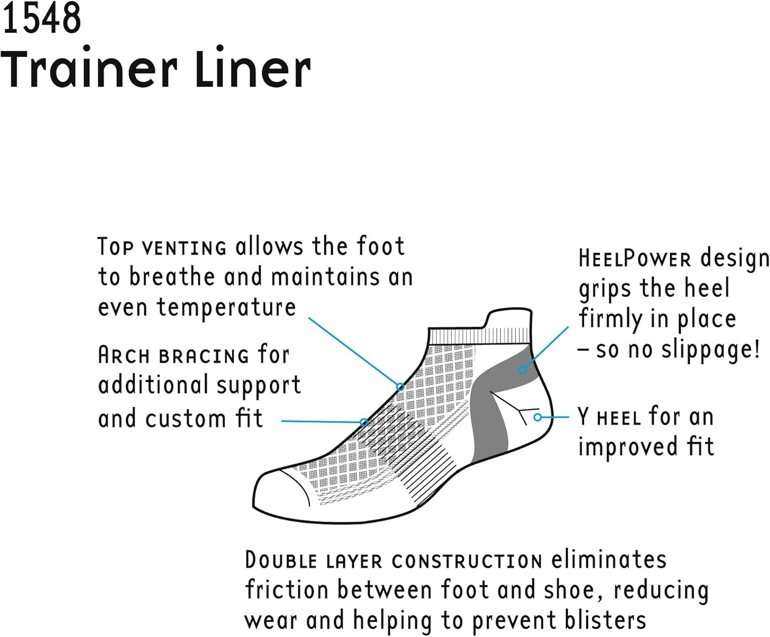 1000 Mile Trainer Liners Socks The ultimate in technical ankle socks The inner layer stays with the foot, the outer layer moves with the shoe, eliminating friction on the skin and reducing wear. Tactel's unique inner layer wicks perspiration towards the moisture-wicking outer layer, keeping it moisture free and comfortable on days of greater distance. Superior ventilation increases breathability, increasing airflow to prevent uncomfortable heat build-up and will keep you happy and motivated. Arch reinforcement and a Y-heel feature to enhance support and create a custom fit, while HeelPower technology firmly grips the heel in place, reducing slippage in the shoe, for smooth, distraction-free steps. Size Guide Small: UK 3-5.5 / EUR 35-38.5 Medium: UK 6-8.5 / EUR 39-42.5 Large: UK 9-11.5 / EUR 43-46.5 X-Large: UK 12-14 / EUR 47-49
