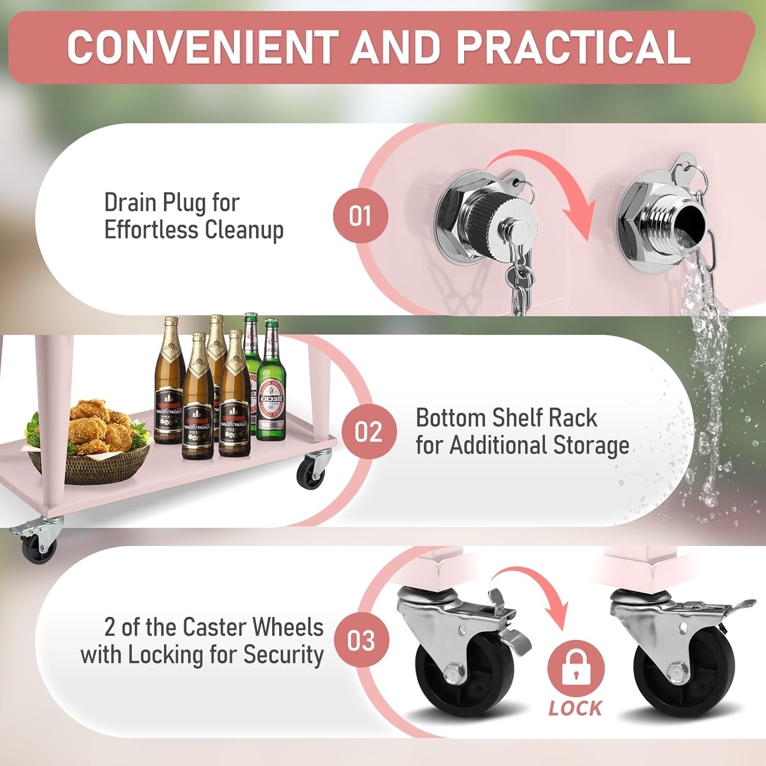 Bring the party with you wherever you go with our portable rolling cooler cart. Made of durable iron with a stylish coloured finish, it's the perfect companion to any outdoor gathering. This 80 quart (20 gallons) cooler has two openings, so you can easily access both sides, and features convenient handles on each side as well. Our outdoor cooler features four wheels which allow you to bring this cooler with you anywhere you go and then keep it in place with two locking wheels