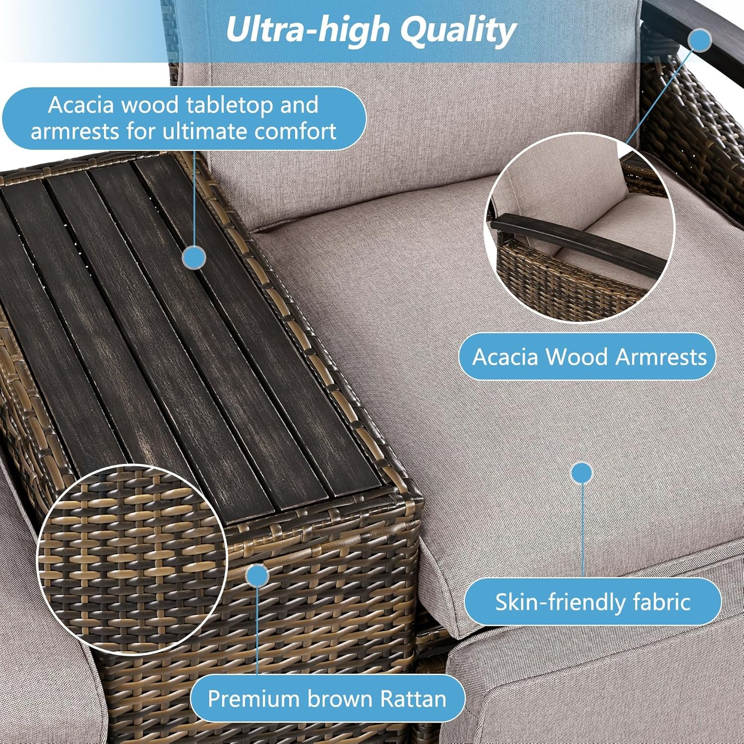 Luxury 2-Person Outdoor Recliner Set with Storage Table – Weather-Resistant & Adjustable Transform your outdoor space with this premium gray wicker patio set, featuring a dual recliner sofa with built-in storage table. Perfect for gardens, patios, or poolside lounging, this set combines modern design with ultimate comfort and functionality. ✔ Built-in Storage Table – Convenient solid acacia wood table for drinks, books, and snacks, plus hidden storage space for blankets and accessories. ✔ Adjustable Reclining (Up to 145°) – Independent backrest & footrest controls for personalized relaxation—perfect for sunbathing or napping outdoors. ✔ Slip-Free Cushion Design – Straps and Velcro keep cushions securely in place for a stable, comfortable seating experience. ✔ All-Weather Durability – Made with fade-resistant PE rattan + sturdy iron frame, supporting 400 lbs per seat. Waterproof polyester cushions ensure long-lasting use. ✔ Complete 2-Person Set – Includes plush cushions (4.7" thick backrest, 3.9" seat) for full-body support. Ideal for couples or solo lounging. Specifications:Material: PE Wicker + Iron Frame + Acacia Wood TableColor: GrayWeight Capacity: 400 lbs/seatCushions: Removable, weather-resistant polyesterAssembly: ~1 hour (tools included)Weight: 62.78 lbs
