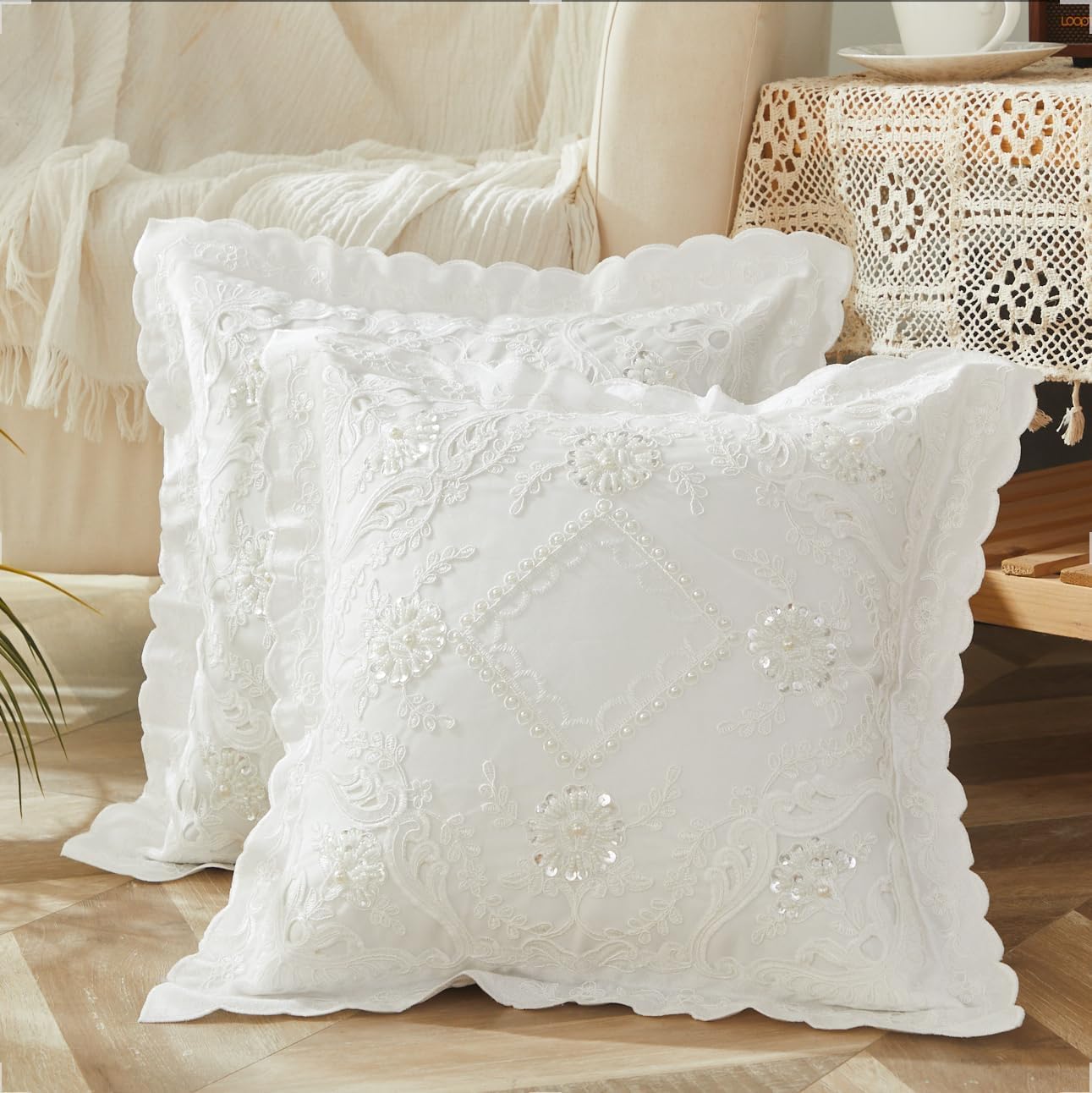 Handcraft Cotton Throw Pillow Covers Wedding Cushion Cases Set of 2 Modern Euro Style Pearl and Sequin Decorative Vintage Floral Embroidery Pillowcases (16'' x 16'', White)